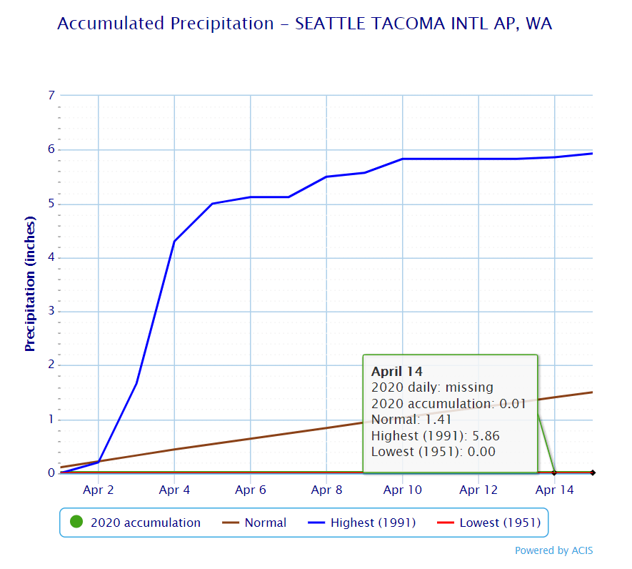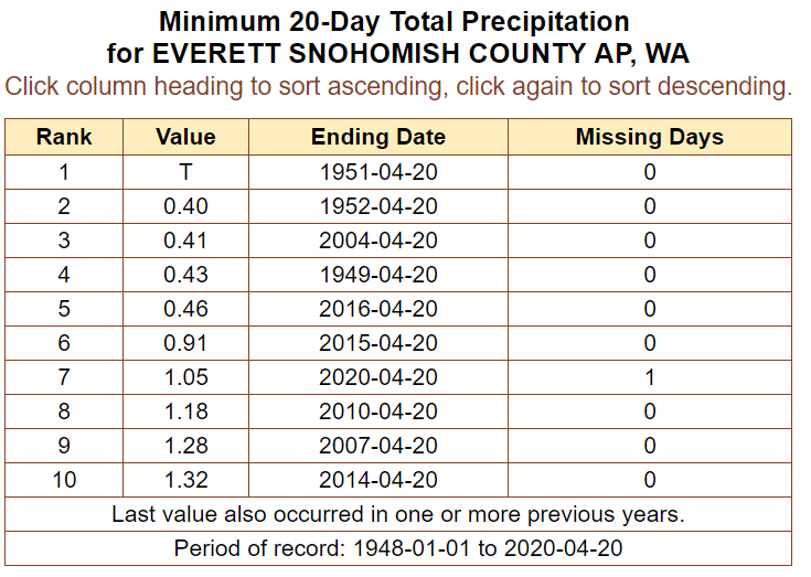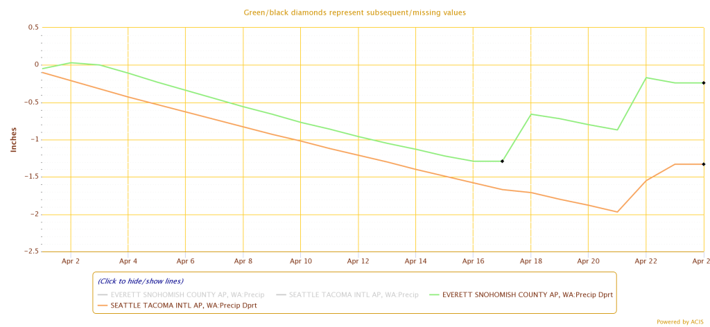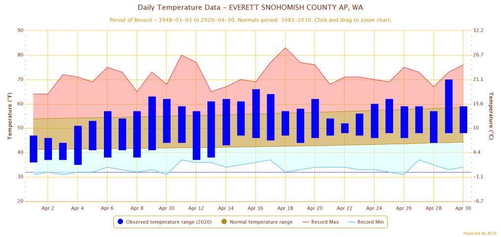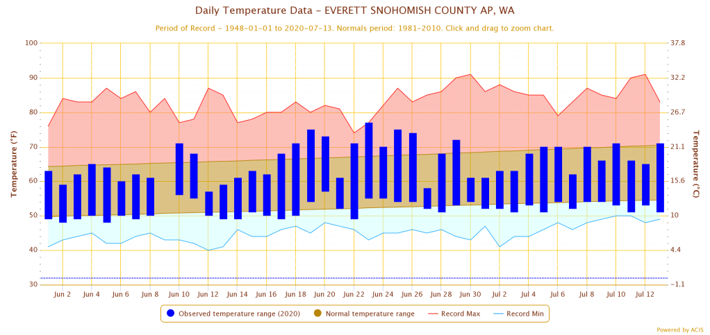 The GFS ensemble members average near 80 degrees for the next several days at KPAE (ensemble averages tend to be more skillful than individual members). After that, it shows a spike in temperatures on Wednesday and Thursday of next week, with high temperatures in the mid-to-upper-80s. This still has time to change as it is still a ways away, but it’s worth keeping an eye on.