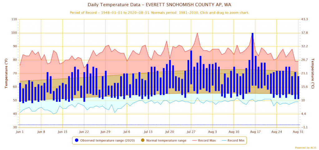 Below is a snapshot of temperatures for the months of June through August. The highest temperature recorded for the summer at Paine Field occurred on August 16, with a temperature reaching 100 degrees! This was only the second time a triple-digit temperature has been recorded at Paine Field, with the first coming on July 29, 2009. August 16 was also when we had some thunderstorms in the area 🙂 ⛈ Two high temperature records were broken: June 23 with 77 degrees and August 16 with 100 degrees.